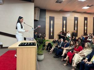 Coube à juíza Karla Rafaelli Ribeiro Valente fazer a saudação aos empossados. Em seu discurso, a magistrada falou sobre as trajetórias, que “por mais diferentes que tenham sido os caminhos da vida, eles nos trouxeram hoje para o mesmo destino. Para alguns, representa a volta para casa, para outros o início de uma jornada longe da família, mas em um novo lar chamado 8ª Região”. A nova empossada citou um trecho do hino da Justiça do Trabalho para encerrar seu discurso, dizendo “justiça da equidade é tua identidade, louvemos a nossa justiça, a Justiça do Trabalho. Obrigada.”.