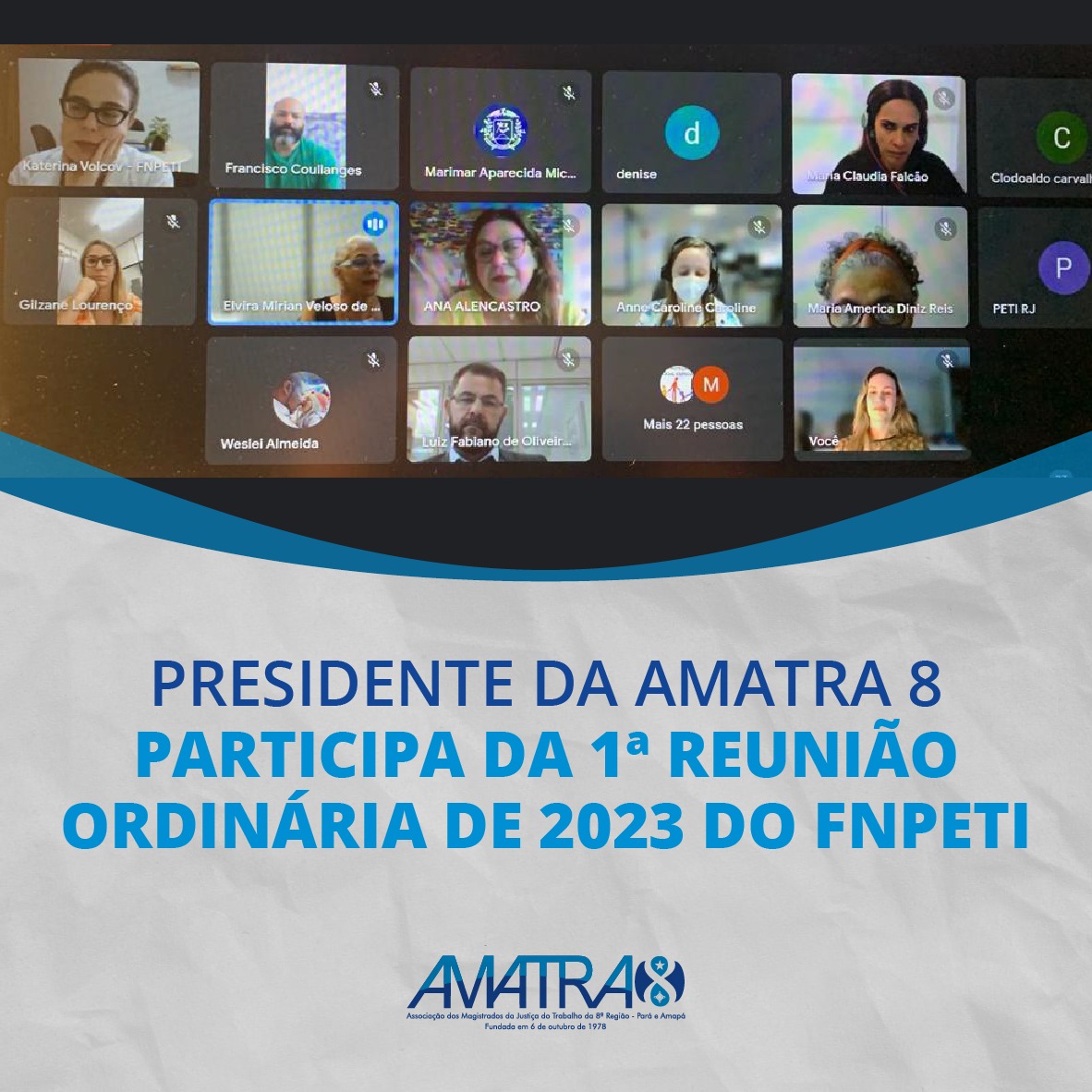 Foi realizada na manhã desta terça-feira (28), a primeira reunião de 2023 de análise da estratégia (RAE) do Tribunal Regional do Trabalho da 8ª Região – TRT8, que reuniu gestores da área administrativa, juízes e desembargadores, no formato presencial, entre eles, a presidente da AMATRA 8, Roberta Santos e a diretora Amanaci Giannaccini.